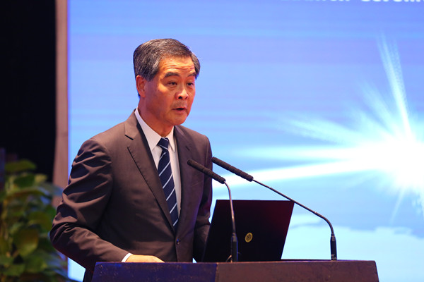 全國(guó)政協(xié)副主席、中國(guó)社會(huì)科學(xué)院“一帶一路”國(guó)際智庫(kù)專家委員會(huì)名譽(yù)主席梁振英致辭。本網(wǎng)記者 張哲 攝