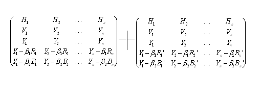 而現(xiàn)在的偽立體電視是由行向量H,幀向量V,亮度向量Y組成的三維線性空間。表達(dá)彩色信息的是由紅向量R,R',綠向量G,G',蘭向量B,B'組成的。共有H,V,Y,R,G,B,R',G',B'九個(gè)向量,通過(guò)不同的線性組合,組成的三維線性空間??捎靡韵伦笥叶€(gè)的矩陣來(lái)表示: