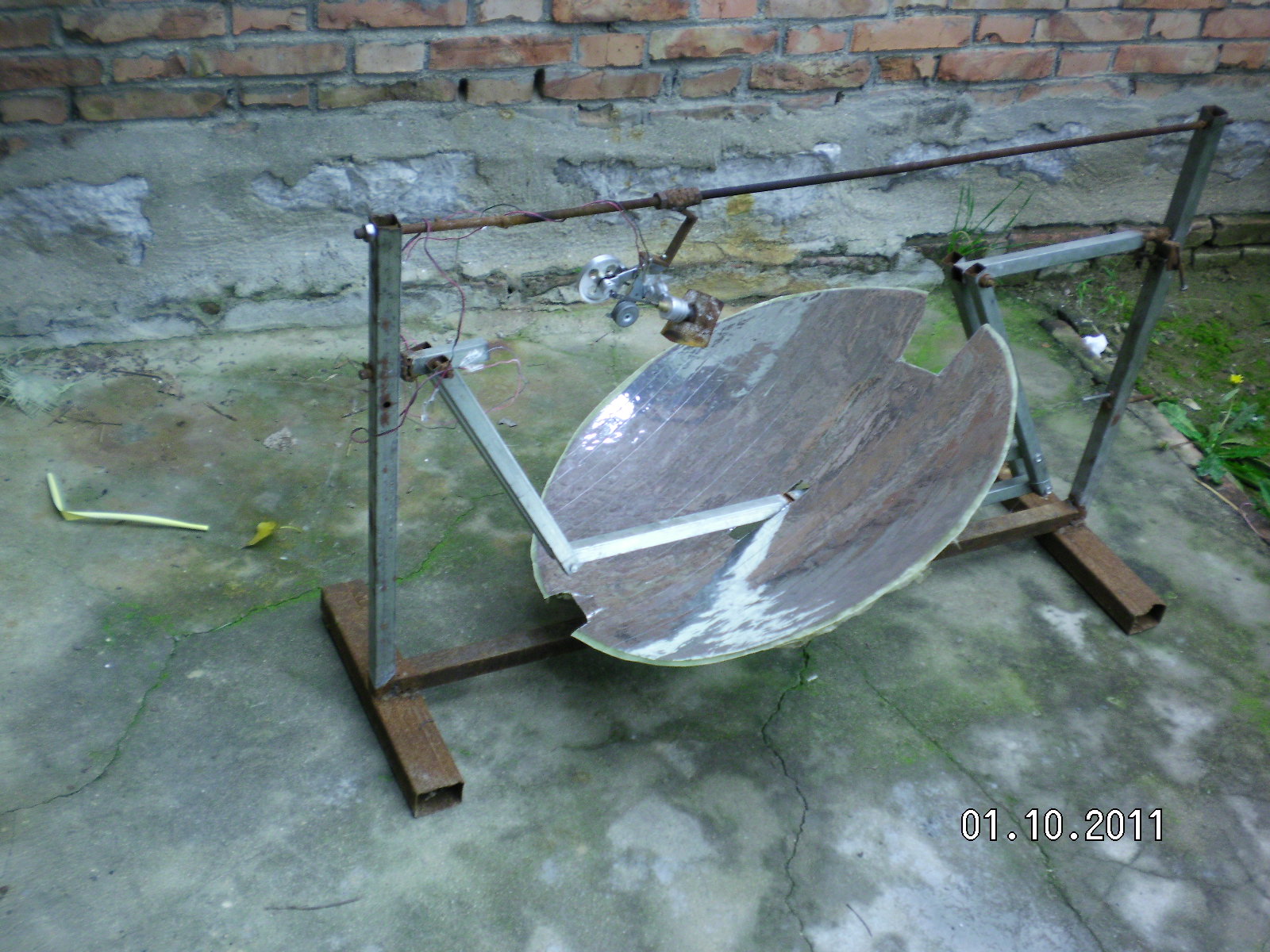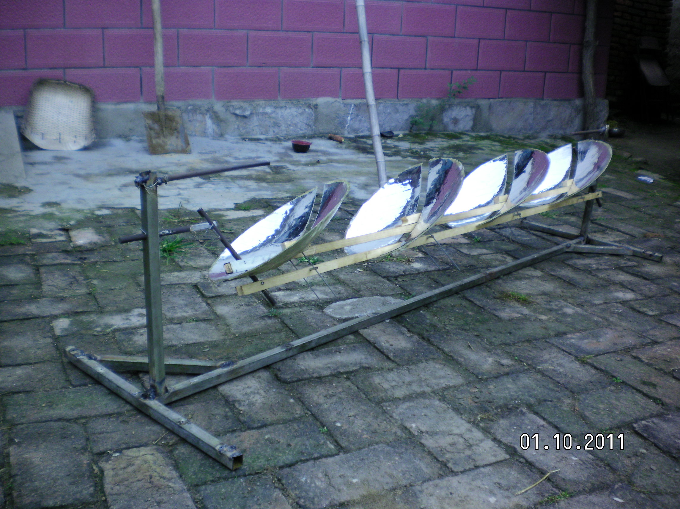 隨著全球環(huán)境惡化和日益嚴峻的能源形勢世界各國對太陽能熱發(fā)電越來越重視?,F在最常用的太陽能熱發(fā)電系統(tǒng)主要有槽式、蝶式和塔式,槽式和蝶式的光熱部件必須隨聚光鏡做相應的運動,槽式各個光熱部件復雜昂貴,蝶式光熱部分只能單獨使用塔式的受熱部分出現故障很難維修這三種系統(tǒng)都有自己的缺點?;诖宋以O計了平行定焦太陽能聚光集熱發(fā)電系統(tǒng):主要有一對支柱.一對轉軸.一對動臂.旋轉拋物面聚光鏡.一根托桿.一根平行桿.平行連桿組成將兩支柱固定在一條直線上,兩轉軸安裝在兩支柱上兩轉軸可以左右轉動,兩動臂安裝在兩轉軸上使可以隨轉軸左右前后擺動。托桿安裝在兩動臂上,平行桿與托桿平行安裝在兩動臂上,這樣動臂.托桿.平行桿構成一個平行凹框。在旋轉拋物面鏡原點安一橫軸并切去部分旋轉拋物面鏡,在橫軸兩端垂直安裝兩根平行連桿,把旋轉拋物面鏡的橫軸安裝在托桿上。在平行桿上安裝連桿軸把平行連桿與連桿軸連接在一起。所述旋轉拋物面鏡的焦距等于托桿與轉軸之間動臂的長度。將動臂對準太陽陽光就會聚焦到固定點上在這些位置安裝光熱部件就會得到熱能用于熱發(fā)電。這種結構是雙軸定焦所以效率很高,抗風性好。這種結構可以做成很小裝在高在15-20cm的透明罩內安裝在樓頂或樓房南墻上,為人們提供開水或蒸汽。請看模型照片: