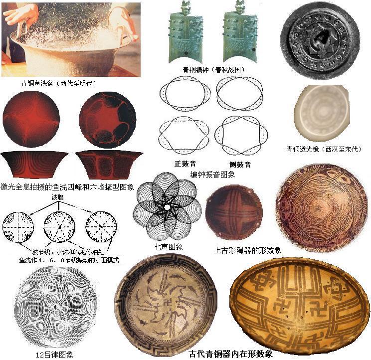 彩陶上的圖象和圖形,展現(xiàn)了上古文明的陳跡,是上文明的結(jié)晶,古埃及是幾何圖形見長,中國上古除了簡單幾何圖形,更多是形數(shù)象。五千年前,文字的發(fā)明,同時青銅器開始出現(xiàn)。中國中古夏代是由陶器向青銅器過渡的時期,殷商能鑄造精美的金器和青銅器。金屬所制的器物比粘土燒制的陶器更具活力,振動聲播、熱導(dǎo)電傳,比陶器優(yōu)越得多,好比近代的機械的熱動性、近現(xiàn)代電氣的電動性,現(xiàn)代電子的信息性,技術(shù)不斷更新。中古的青銅器治金和鑄造技術(shù),沒有現(xiàn)代技術(shù)先進,但青銅器一此特殊功能,卻令現(xiàn)代人嘆為觀止,難以模仿。青銅器關(guān)鍵是內(nèi)在的器構(gòu),不是外部形體結(jié)構(gòu)。商代為青銅器發(fā)展的頂盛時期,其鑄造技術(shù)一直延續(xù)至明代的近代機械鐵器鑄造興起才失傳。要問中國古代科技成就,眾人熟知的活字印刷、造紙、火藥、指南針的四大發(fā)明,這些都是小科技。中國古代高端科技是供人玩樂的中華青銅三大寶,魚洗盆、編鐘、透光鏡,其深藏科學的大道理。如圖〖古代青銅器內(nèi)在形數(shù)象〗所示,經(jīng)激光全息拍攝,青銅器內(nèi)在振動圖象,正是上古彩陶上的形數(shù)象,摩擦叩擊,洪鐘音樂,透光鏡正面采光,背現(xiàn)影像。中華青銅三大寶展示了中國古代科技工藝,采用了高超的系統(tǒng)數(shù)理,八卦符只是系統(tǒng)工具,形數(shù)象才是系統(tǒng)數(shù)理核心。