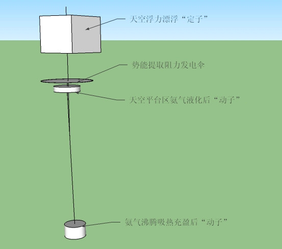 如上圖所示:設(shè)計一種系統(tǒng),在地面的時候“動子”里面的物質(zhì)呈氣態(tài),而且單位體積明顯輕于空氣,就會形成比較大的浮力,使“動子”具有上升的趨勢,放開“動子”任其在浮力下,自由上升,當(dāng)上升到一定高度后,“動子”內(nèi)的氣體由于溫度明顯下降而液化成液體,這時浮力消失,“動子”在重力作用下會快速下落。這就形成了一個利用熱能、勢能、動能之間相互轉(zhuǎn)化而形成的一個“永動系統(tǒng)”而且能從外界獲取可觀能源來發(fā)電。只要做出“動子”上升時保溫,上升到一定高度后能自由撤銷保溫狀態(tài)進(jìn)行熱交換就可以了。