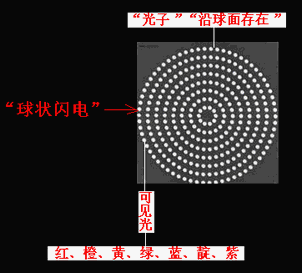 “棒電極”在球心對“球冠電極”“超短時間內(nèi)的高能”(超高壓)充電、放電,可以產(chǎn)生“球狀閃電”,其機理為:“雙向激擊”、“球冠振蕩”。若地面為“球冠電極”,則表現(xiàn)為“滾地雷”“火球”,若空中云為“球冠電極”,則表現(xiàn)為空中“光球”。因為“球冠振蕩”的頻率的不同,“球狀閃電”內(nèi)部呈現(xiàn)“嵌套球狀”,由外向里頻率由小到大,在可見光波段由外向里顯現(xiàn)為紅、橙、黃、綠、藍、靛、紫,而由外向里看,因疊加合成呈現(xiàn)白色,但是,當(dāng)最外面的頻率較小時,也可能是黃色或綠色或藍色的;一個大“光球”,可以分離為兩個或幾個小“光球”,但其顏色將會“變深”(如圖6、7)。 [6]