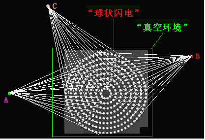 如圖12,A、B、C等處的光源發(fā)出的光線,在通過“球狀閃電”時,都在“球狀閃電”中的“光子流體能量負壓”的作用下,被“吸入”“留住”作“圓周運動”,而不能穿過“球狀閃電”,光源對面的觀察者將不能看到這個光源發(fā)出的光線——呈現(xiàn)“黑洞效應(yīng)”。