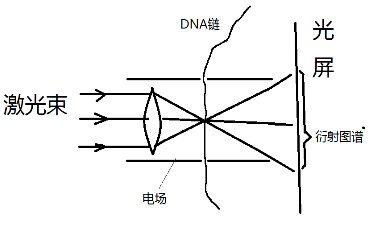 測序流程:合成一段已知序列的單鏈DNA,要求含有全部A G C T四種核苷酸。在脈沖電場作用下,這段已知序列的帶負電的DNA單鏈被拉直并一堿基一堿基的通過納米孔,每通過一個堿基便會出現(xiàn)數(shù)微秒的停頓。低能超細高頻激光束經(jīng)過聚焦,在焦點處與剛剛經(jīng)過納米孔的DNA單鏈相遇,經(jīng)過衍射,在另一側(cè)的光屏上形成衍射圖譜,由于DNA單鏈的間續(xù)性運動,會產(chǎn)生間續(xù)性衍射圖譜,以衍射圖譜與DNA序列作對比,可以得出每種圖譜對應的堿基。