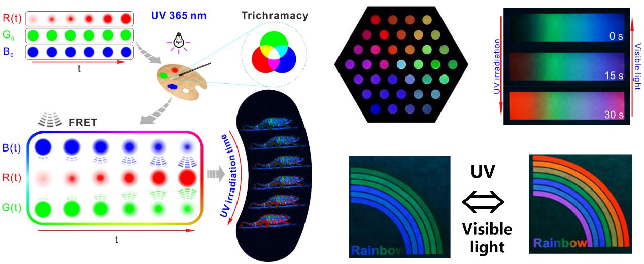 比如發(fā)光的防偽材料,利用纖維素均相可控反應(yīng)的優(yōu)勢,把原來容易聚在一起的熒光分子,通過化學(xué)方法鍵合到纖維素上,克服了溶液狀態(tài)下聚集誘導(dǎo)淬滅效應(yīng),將其制成固態(tài)熒光材料,同時它仍然具有高分子的可打印、可噴涂的特點,將不同的發(fā)光基團(tuán)接到不同的纖維素上可以得到不同的顏色,將紅、綠和藍(lán)三種顏色的纖維素衍生物共混,利用三基色原理,還可以做打印的動態(tài)熒光材料(圖5)。