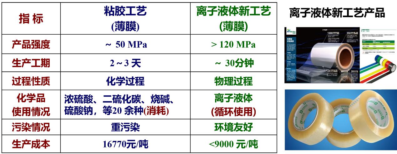以前纖維素制膜工藝污染很大,中國逐漸在關(guān)停。而我們的離子液體工藝是物理溶解,基本沒有污染。原來工藝需要三天時間,現(xiàn)在三十分鐘就做出來了(圖8)。在車間里面都聞不到氣味,火都點不著,非常安全。其中溶劑是我們的專利,包括后面的溶劑回收,溶劑是可以回收再反復(fù)利用的。用我們這個工藝與企業(yè)合作建立了生產(chǎn)線,2019年基本已經(jīng)建成了,今年11月底試車。生產(chǎn)的產(chǎn)品推薦在快遞物流上使用,特別是用低成本秸稈做的膠帶,有很好的應(yīng)用前景。