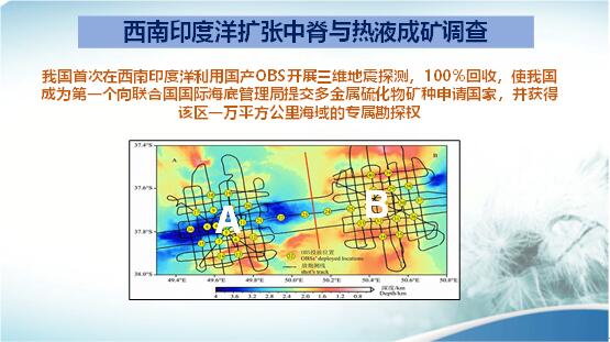 在全球的海洋中,大部分海洋為公海,有些國家已圈出自己具有礦產(chǎn)調(diào)查和開采權的某片海域。我們國家在西南印度洋布設了“中國結”的地震臺網(wǎng),開展三維地震觀測。并第一個向聯(lián)合國國際海洋海底管理局申請,獲得了這一地區(qū)一萬平方公里的多金屬硫化礦物的專屬開采權。