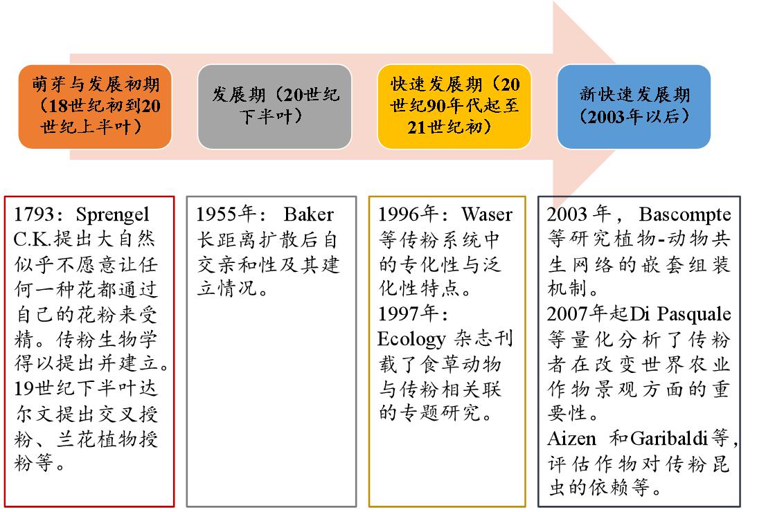 由于傳粉昆蟲的重要性以及目前所面臨的危機(jī)已經(jīng)引起科學(xué)家和民眾的廣泛關(guān)注。諸多地區(qū)級(jí)、國(guó)家級(jí)乃至全球級(jí)別的傳粉研究已經(jīng)取得了階段性的成果。就全球范圍來說,傳粉昆蟲的研究主要包括四個(gè)時(shí)期,分別為:1)萌芽與發(fā)展初期(18世紀(jì)初到20世紀(jì)上半葉);2)發(fā)展期(20世紀(jì)下半葉);3)快速發(fā)展期(20世紀(jì)90年代起至21世紀(jì)初);4)新快速發(fā)展期(2003年以后)。
