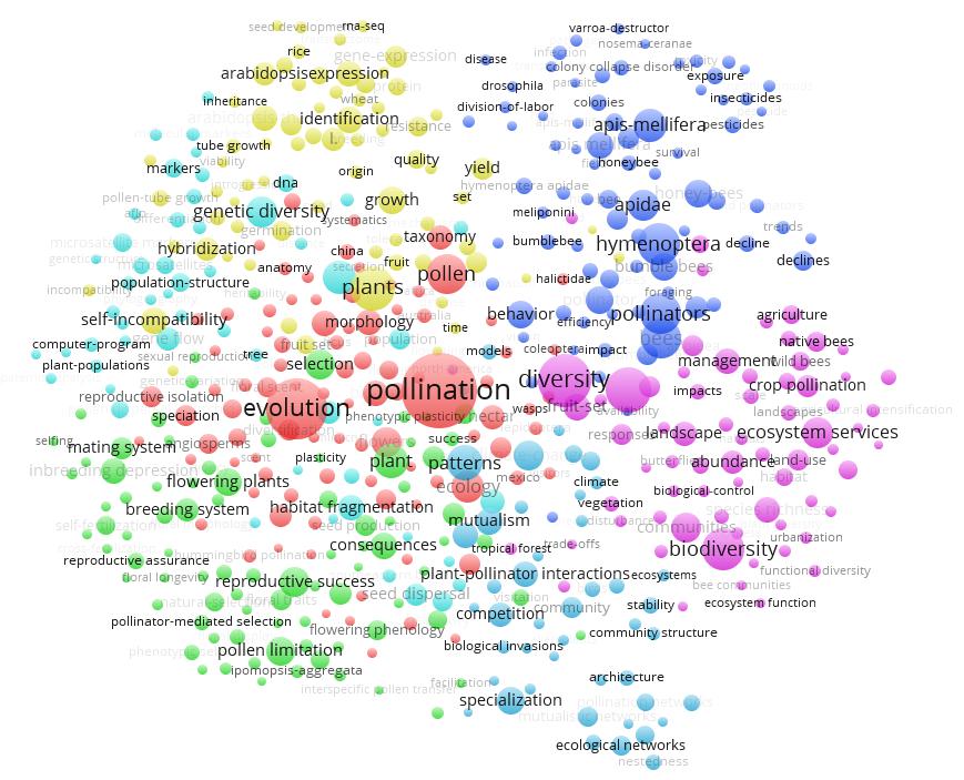 與此同時(shí)我們還通過ESI對(duì)pollination和pollinator等關(guān)鍵詞進(jìn)行檢索,可以大致得出傳粉昆蟲研究領(lǐng)域的現(xiàn)有研究前沿如下:1)常用新煙堿類殺蟲劑對(duì)蜜蜂的殺傷作用;2)野生授粉昆蟲對(duì)農(nóng)業(yè)增收和作物健康的積極影響;3)傳粉昆蟲種群測(cè)量與評(píng)估;4)花朵與傳粉昆蟲的生態(tài)聯(lián)系。通過利用Vos Viewer軟件繪制傳粉生物學(xué)關(guān)鍵詞共現(xiàn)(co-occurrence)聚類圖,獲得傳粉生物學(xué)領(lǐng)域的研究熱點(diǎn)包括:1)傳粉昆蟲的形態(tài)學(xué)、系統(tǒng)進(jìn)化、分類學(xué)方面的研究;2)傳粉昆蟲介導(dǎo)的植物繁殖、選育、選種等的研究,以及花粉限制對(duì)傳粉昆蟲的影響;3)殺蟲劑導(dǎo)致傳粉昆蟲,尤其是蜜蜂、熊蜂的種群下降的影響;4)傳粉昆蟲介導(dǎo)的植物基因表達(dá)、生長(zhǎng)、增產(chǎn)等;5)景觀變化、城市化等環(huán)境因素導(dǎo)致生物多樣性降低、傳粉服務(wù)功能下降、傳粉昆蟲群體數(shù)量下降等影響評(píng)估,并提出相關(guān)的控制與管理措施;6)植物-傳粉昆蟲互作與共生、植物與傳粉昆蟲形成的生態(tài)網(wǎng)絡(luò)結(jié)構(gòu)等方面的研究;7)傳粉使植物基因流擴(kuò)散,使植物基因變異和多樣性。