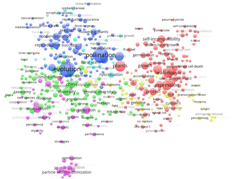 利用Vos Viewer軟件分析2013-2017年中國(guó)傳粉生物學(xué)領(lǐng)域的SCI論文,獲得中國(guó)傳粉生物學(xué)領(lǐng)域的研究熱點(diǎn)是:1)植物花粉管生長(zhǎng)、發(fā)育等分子、細(xì)胞層面基礎(chǔ)機(jī)制研究;2)傳粉昆蟲的分類學(xué)研究,及其遺傳多樣性、保護(hù)、種群擴(kuò)散等方面的研究;3)昆蟲傳粉在植物遺傳育種、進(jìn)化中發(fā)揮重要作用;4)與傳粉相關(guān)的植物轉(zhuǎn)錄因子、microRNA、殺蟲劑耐藥性等方面的研究;5)傳粉昆蟲的種群優(yōu)化、傳粉昆蟲互作等方面的研究。